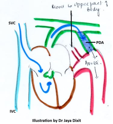 Because the foetal lungs are not functioning, only about 10% of this blood goes to the lungs. The majority bypasses the lungs through the patent ductus arteriosus (PDA) and enters the systemic circulation, supplying the lower part of the body.